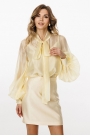 Блузка + топ. Блузка выполнена из креш-органзы. Блузка прямого силуэта, длиной выше линии бедер. Перед и спинка цельные. Спереди прорезь. Воротник-стойка, переходящий в бант. Рукав втачной, одношовный, расширенный к низу и присборенный. Низ рукава на притачной манжете, застегивающейся на четыре пуговицы.