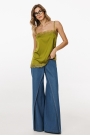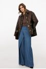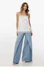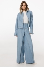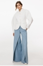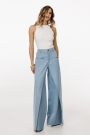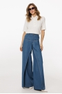 Джинсы-клеш выполнены из плотного джинса. Брюки на притачном поясе, длиной до пола, расширенные к низу. Спереди верхние отлетные части, боковые карманы с фигурным входом. Застежка на пуговицу и молнию с гульфиком. На задних частях кокетки и накладные карманы. По переду брюки декорированы брендированной нашивкой из натуральной кожи.