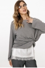 Джемпер выполнен из трикотажного полотна с рисунком. Джемпер прямого силуэта, длиной до линии бедра. Перед и спинка цельные. Горловина округлой формы, обработана широкой бейкой. Плечевой шов удлинен. Рукав одношовный, прямой.