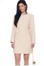 Приталенное платье длиной мини с длинным рукавом и расширенной линией плеча за счёт плечевых накладок. По бокам шнуровка позволяющая регулировать прилегание. Застёжка на потайную молнию сзади.