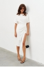 Комплект из трикотажного полотна состоящий из платья-туники и шорт. Платье со спущенным плечом и рукавом до локтя, горловина отделана эластичной бейкой. Сбоку, чуть ниже талии, конструктивный элемент в виде узла, переходящего в высокий разрез. Через узел протянуто декоративное золотое кольцо. Шорты плотно прилегающие на резинке по поясу.