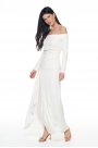 Платье длины макси выполнено на сочетании мягкого, трикотажного полотна и струящегося атласа. Лиф изделия без плечей плотно держится на фигуре засчёт плотного прилегания. По переду в области талии заложены складки. Атласная юбка асимметричная с большим расклешением.