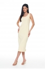 Платье прилегающего силуэта длиной миди. Вырез горловины - каре. Сзади шлица и застёжка на потайную молнию.