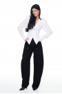 Брюки из плотного денима с выраженным объемом в области бедер и колен, сужающиеся книзу. Имеют сложные конструктивные членения с вертикальными рельефами, переходящими в коленные швы, что подчеркивает объемную форму. Спереди имеются классические карманы, сзади - накладные, прямоугольной формы. Притачной пояс со шлевками для ремня. Застежка на гульфик с молнией и пробивную металлическую пуговицу. По всем конструктивным швам (рельефам, входу в карманы, поясу, гульфику) проложены декоративные отделочные строчки.