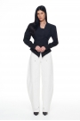 Брюки из плотного денима с выраженным объемом в области бедер и колен, сужающиеся книзу. Имеют сложные конструктивные членения с вертикальными рельефами, переходящими в коленные швы, что подчеркивает объемную форму. Спереди имеются классические карманы, сзади - накладные, прямоугольной формы. Притачной пояс со шлевками для ремня. Застежка на гульфик с молнией и пробивную металлическую пуговицу. По всем конструктивным швам (рельефам, входу в карманы, поясу, гульфику) проложены декоративные отделочные строчки.