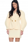 Костюм из плотной поливискозы состоящий из жакета и мини-юбки. Жакет на подкладке приталенного силуэта придаёт фигуре эффект песочных часов. Архитектурные рукава делают образ сложным и изысканным. Застежка на две большие золотые пуговицы. Юбка-мини на подкладке с застёжкой на потайную молнию сзади.