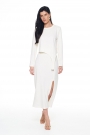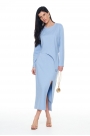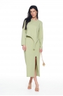 Комплет состоит из джемпера и юбки. Джемпер прямого силуэта укороченный, перед ассиметричный. По переду декоративный элемент полукольцо. Рукав длинный одношовный. Спинка разрезная. Горловина обработан бейкой с основной ткани. Низ рукова и изделия обработан на плоскошевной машине. Юбка миди прямого силуэта с завышенной линией талии, по преду юбки распаложен разрез. Верх юбки обработан обтачкой и резинкой, низ юбки на плоскошевной машине.