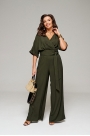 Комбинезон изготовлен из натурального вискозного полотна. Предлагаемая модель свободного кроя. Передняя, верхняя часть выполнена в полюбившемся многим стиле «на запах». В боковом шве передней части комбинезона предусмотрены боковые функциональные карманы. Задняя часть комбинезона разрезная по среднему шву, с двумя талиевыми выточками и потайной застежкой на молнию. Рукав цельнокроеный, спущенный, широкий. По низу рукава расположена отлетная манжета. По всей ширине талии вставлена резинка, шириной 2,5см.