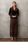 Юбка прямого силуэта из атласа и кружева. Юбка на обтачке. По переднему и заднему полотнищам юбки - вытачки. Юбка с застежкой в боковом шве на потайную тесьму-молнию. Верхняя часть юбки из атласа с асимметричный краем, нижняя часть юбки из кружева с ажурным низом. Юбка без подкладки.