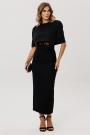 Юбка выполнена из костюмно-плательной ткани с блеском. Юбка прямого силуэта, зауженная к низу, длиной миди. Юбка на поясе, застегивается на петлю и пуговицу и на потайную молнию сзади в среднем шве. Юбка на отлетной по низу подкладке. В комплект входит два съемных ремня из основной ткани с обтяжной пряжкой и блочками.