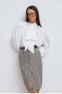 На переде изделия расположен декоративный карман (в боковых швах расположены функциональные карманы) и функциональная шлица. Юбка прекрасно корректирует фигуру, придаёт образу женственность и элегантность.