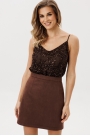 Юбка выполнена из плотной искусственной замши. Юбка прямого силуэта, длиной выше линии колена. Перед...