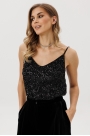 Топ выполнен из сетки с вышивкой пайетками. Топ прямого силуэта, длиной выше линии бедер. Топ на отлетной по низу трикотажной подкладке. Бретели регулируемые по длине.