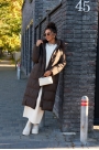 Застежка центральная на двустороннюю молнию от верха до низа. Низ изделия ровный. Для удобства движения внизу в боковых швах предусмотрены высокие разрезы на декоративных молниях. Подкладка гладкая с наличием внутреннего кармана слева. К модели прилагается пояс-завязка, вдеваемый в держатели на боковых швах.