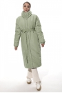 Пальто на утепленной подкладке. Пальто утепленная, с центральной застежкой на молнию, с высоким воротником- стойкой, планкой, застегивающейся на кнопки. На полочках расположены прорезные карманы с листочками. Рукав втачной, с отрезной манжетой. Манжета присборена на резинку. Плечо спущенное. Пальто со съемным поясом.