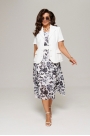 Передняя верхняя часть с двумя нагрудными вытачками. Спинка разрезная по среднему шву с небольшим разрезом в верхней части, с фиксацией на пуговицу. Платье отрезное по линии талии, в котором вставлена резинка. Нижняя часть расширена по типу 'полусолнце'.