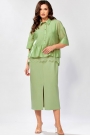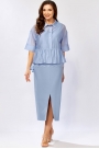 Платье полуприлегающего силуэт, без рукавовс V - образным вырезом. Платье длинное с разрезом по переду, спинка разрезная. Низ изделия подшит на плоскошовной машине. Блузка прямого силуэта с воротнтком стойкой, с коротким спущенным рукавом на манжете. Застежка по переду до талии на пели-пуговицы. По низу изделия баска, по переду настрочено декоративное кружево. Спинка удлиненная.