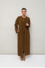 Трикотажное платье полуприлегающего силуэта в длине миди. Округлый вырез горловины. Рукава втачные в длине до локтя. В левом боковом шве обработан высокий разрез. В комплекте прилагается пояс из основной ткани.