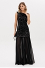 Платье выполнено из барахата с пайетками. Платье Х-образного силуэта, длиной в пол. Верх платья выпо...