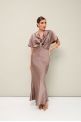 Платье полуприлегающего силуэта, отрезное по талии, выполнено из струящейся ткани с матовым блеском. V-образный вырез горловины. Спереди лифа обработан декоративный узел. Рукава короткие цельнокроеные. Спинка лифа со средним швом, по линии талии для комфорта обработана резинка. Крой юбки по косой.