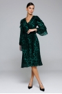 Платье шифоновое полуприлегающего силуэта с втачным рукавом внизу на резинке. Платье отрезное по линии талии на резинке. Лиф на запах с кокеткой и нагрудной вытачкой. Нижняя часть платья расклешенная. По переду и рукаву вставлен волан. Платье на подкладке. Пояс из основной ткани в комплекте.