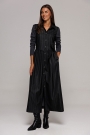 Платье длинное из костюмной ткани с втачным длинным одношовным трикотажным рукавом. Полочка с центральной застежкой на петли пуговицы и с нагрудными вытачками. По спинке нашивка 'BUTER'. Платье отрезное по линии талии и со сборкой по шву притачивания низа. Воротник рубашечный отложной на стойке. По линии талии бант из основной ткани. Платье без подкладки.
