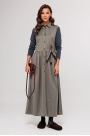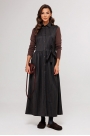 Платье длинное из костюмной ткани в полоску из люрекса с втачным длинным одношовным трикотажным рукавом. Полочка с центральной застежкой на петли пуговицы и с нагрудными вытачками. По спинке нашивка 'BUTER'. Платье отрезное по линии талии и со сборкой по шву притачивания низа. Воротник рубашечный отложной на стойке. По линии талии бант из основной ткани. Платье без подкладки.