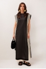 Платье длинное, состоящие их верхнего и нижнего. Верхнее платье из полупрозрачной ткани, слегка расклешенное к низу без рукавов. По бокам платье не стачено с завязкой на декоративный шнурок. По всей длине полочки и спинки по бокам настрочено кружево. Горловина округлая с притаченым к ней кружевом. По спинке вырез капля с застежкой на навесную петлю-пуговицу. Нижнее платье А-силуэта без рукавов, с карманами в боковых швах. Вырез горловины – округлый.