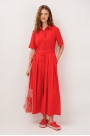 Платье длинное с втачным коротким рукавом до локтя визу на притачной манжете. Полочка с центральной застежкой на петли-пуговицы по притачной планке и с карманами в боковых швах. Платье отрезное по линии талии, лиф с талиевой вытачкой, юбка со встречными складками от талии. Спинка с кокеткой и нашивкой на кокетке. Воротник рубашечный отложной на стойке. Платье без подкладки. Съемный пояс из основной ткани на полукольцах.