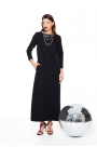 Платье из костюмно-плательной ткани, умеренного объема, прямого силуэта, с застежкой на потайную молнию в среднем шве спинки. Перед с круглым вырезом горловины и нагрудными вытачками. Спинка с V-образным вырезом горловины, средним швом и разрезом. Вырез горловины и средний шов спинки оформлены воланом. Рукав 3/4, втачной, одношовный. Длина платья до щиколотки.