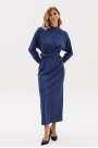Платье выполнено из тонкой искуственной замши. Платье полуприлегающего силуэта, длиной миди. Платье отрезное по линии талии. Спереди и на спинке талиевые вытачки и средний шов. Застежка на потайную молнию в среднем шве спинки. Воротник-стойка. Рукав покроя реглан. Средний шов переда, талиевые вытачки, верхний шов рукава и линии реглана обработаны 'на лицо'. В комплект входит съемный ремень из основной ткани с обтяжной пряжкой.