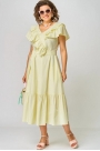 Платье женское нарядно-повседневное полуприлегающего силуэта до талии и расширенное к низу. Платье отрезное по линии талии, вырез горловины V-образный с ассиметричными рюшами из тканей двух дизайнов. Рукав втачной из шифона по низу на резинке. В боковых швах платья обработаны карманы, по низу притачной волан из основной ткани. Декором платья служит съемный пояс из основной ткани.