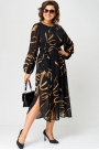 Платье женское нарядно-повседневное А-образного силуэта, выполнено из креп-шифона. Платье на трикотажной подкладке. Вырез горловины круглый на обтачке, по спинке застёжка на навесную петлю и пуговицу. Рукав втачной по низу собран на резинку. В боковых швах обработаны разрезы, низ платья фигурный. Декором платья служит принт самой ткани. Пояс в комплекте.