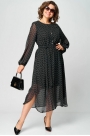 Платье женское нарядно-повседневное А-образного силуэта, выполнено из креп-шифона. Платье на трикотажной подкладке. Вырез горловины круглый на обтачке, по спинке застёжка на навесную петлю и пуговицу. Рукав втачной по низу собран на резинку. В боковых швах обработаны разрезы, низ платья фигурный. Декором платья служит принт самой ткани. Пояс в комплекте.