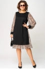 Платье женское нарядно-повседневное полуприлегающего силуэта расширенное к низу. Выполнено из трикотажного полотна в сочетании с шифоном. Вырез горловины круглый на обтачке, рукав втачной из шифона по низу на притачной манжете. По низу вставки из шифона с воланами. Декором платья служат отделочные вставки из шифона и дизайн основной ткани.