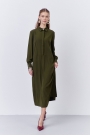 Платье прямого силуэта с потайной застежкой по переду. Характеристики: выполнено из плательной ткани в цвете хаки, застежка на петли и пуговицы, отрезное по талии, по низу рукавов манжеты.