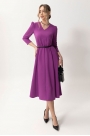 Платье с застежкой на потайную молнию в среднем шве спинки, без воротника, с V-образным вырезом горловины. По переду с нагрудными вытачками. Платье отрезное по линии талии. Шов по талии присборен на резинку. По низу верхней части переда- сборка. Нижняя часть переда и спинки состоит из четырех клиньев. Спинка со средним швом. Платье со съемным поясом. Рукав втачной, 3/4. Окат рукава со сборкой. В боковых швах расположены карманы.