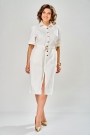 Платье полуприлегающего силуэта, длина ниже колена. С коротким в тачным рукавом на манжете. Спинка разрезная. По переду шлица, застежка на петли пуговицы. В комплекте идет отлетной пояс. По переду два прорезных кармана.