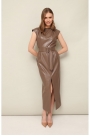 Стильное платье отрезное по линии талии в длине миди, выполнено из экокожи. Округлый вырез горловины. По плечевым швам лифа и по талии обработаны защипы. Юбка со средним швом, переходящим в разрез. Спинка в V-образным вырезом. В среднем шве застёжка на потайную тесьму молнию. В комплекте прилагается пояс из основной ткани с обтяжной пряжкой.