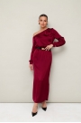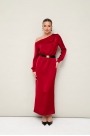 Вечернее платье полуприлегающего силуэта, выполнено из струящейся ткани с благородным матовым блеском. Ассиметричный вырез горловины с открытым плечом. Правый плечевой шов декорирован складками. Платье отрезное по линии талии на резинке. Рукава длиннные с манжетами с застежкой на петли и пуговицы. По спинке в среднем шве юбки обработан разрез.