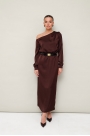 Вечернее платье полуприлегающего силуэта, выполнено из струящейся ткани с благородным матовым блеском. Ассиметричный вырез горловины с открытым плечом. Правый плечевой шов декорирован складками. Платье отрезное по линии талии на резинке. Рукава длиннные с манжетами с застежкой на петли и пуговицы. По спинке в среднем шве юбки обработан разрез.