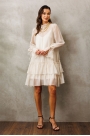 Платье из креп-шифона с напылением А-силуэта, состоящее из 2 слоев. Верхний слой: Втачной длинный рукав со сборкой по окату и внизу на завязке, полочка и спинка с притачными слегка присборенным воланом с рюшей,в оротник стойка-рюша и вырезом каплей по переду на завязке. Нижний слой: платье на бретелях.