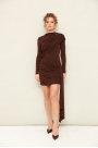 Платье прилегающего силуэта в длине мини, выполнено из эластичной ткани - масло. Горловина с цельнокроеной стойкой. Рукава длинные втачные. Перед и спинка декорированы диагональными деталями со сборкой в области лифа и бедер.
