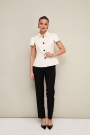Жакет полуприлегающего силуэта, с центральной застежкой на петли и пуговицы. Отложной воротник со стойкой. Рукава короткие с вытачками по окату и разрезами по низу. Жакет на подкладке.