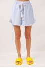 Шорты хлопковые на притачном отстроченном поясе со втянутым в него декоративным шнурком. По переду карманы в боковых швах с наклонным входом. Низ шорт фигурный и по низу притачена рюша.