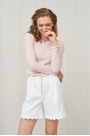 Шорты прямого свободного кроя. Низ изделия декорирован тесьмой. Пояс шорт стабильный, в боковых швах карманы.
