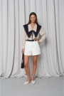 Шорты женские, короткие, слегка расширенные к низу. На поясе расположены шлёвки. На задней половине шорт расположены накладные карманы. Застёгиваются на молнию, крючки и потайную кнопку. Шорты минималистичные, прекрасно подойдут к любому образу!