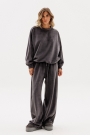 Брюки на притачном поясе с эластичной тесьмой, прямого силуэта, длиной в пол, покроя 'oversize'. Боковой шов заменен лампасом. В швах лампаса карманы. Сзади накладные карманы. В пояс протянут шнур с наконечниками. По низу брюк втянута эластичная тесьма с фиксаторами. Лампасы и пояс выполнены из основной ткани, но без рубчика.