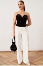 Корсет женский, прилегающего силуэта, выполнен из плотной ткани. Модель с глубоким фигурным вырезом горловины в форме «сердца» (бюстье), без бретелей. Перед и спинка оформлены вертикальными рельефами, в которые вставлены корсетные косточки для создания жесткой формы и подчеркивания талии. Нижний край изделия фигурный, с небольшим удлинением по центру переда. Застежка на потайную тесьму-молнию расположена в среднем шве спинки. Изделие на подкладке, верхний срез обработан обтачкой.