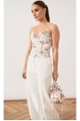 Корсет женский, прилегающего силуэта, выполнен из плотной ткани. Модель с глубоким фигурным вырезом горловины в форме «сердца» (бюстье), без бретелей. Перед и спинка оформлены вертикальными рельефами, в которые вставлены корсетные косточки для создания жесткой формы и подчеркивания талии. Нижний край изделия фигурный, с небольшим удлинением по центру переда. Застежка на потайную тесьму-молнию расположена в среднем шве спинки. Изделие на подкладке, верхний срез обработан обтачкой.